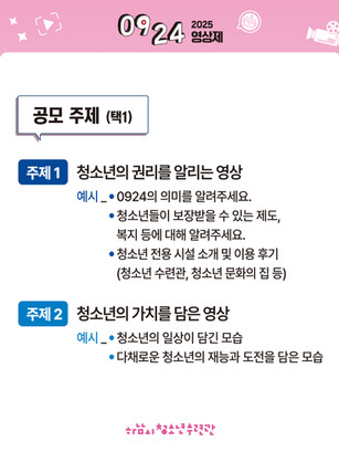 0924영상제는 청소년의 권리와 제공받을 수 있는 정보 등을 알리기 위한 취지로 진행됩니다. 이를 위해 유튜브를 활용하고 있으며, 출품된 작품의 효과성과 홍보를 위한 수단으로 활용되고자 투표 형식의 참여 제도를 마련하였습니다.